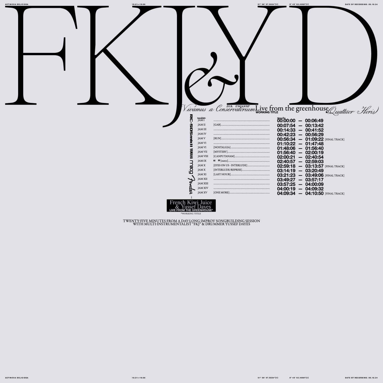'Live From The Greenhouse' is an intentionally unplanned live session by multi-instrumentalist FKJ and drummer Yussef Dayes, recorded near London and filmed by director Uncanny.